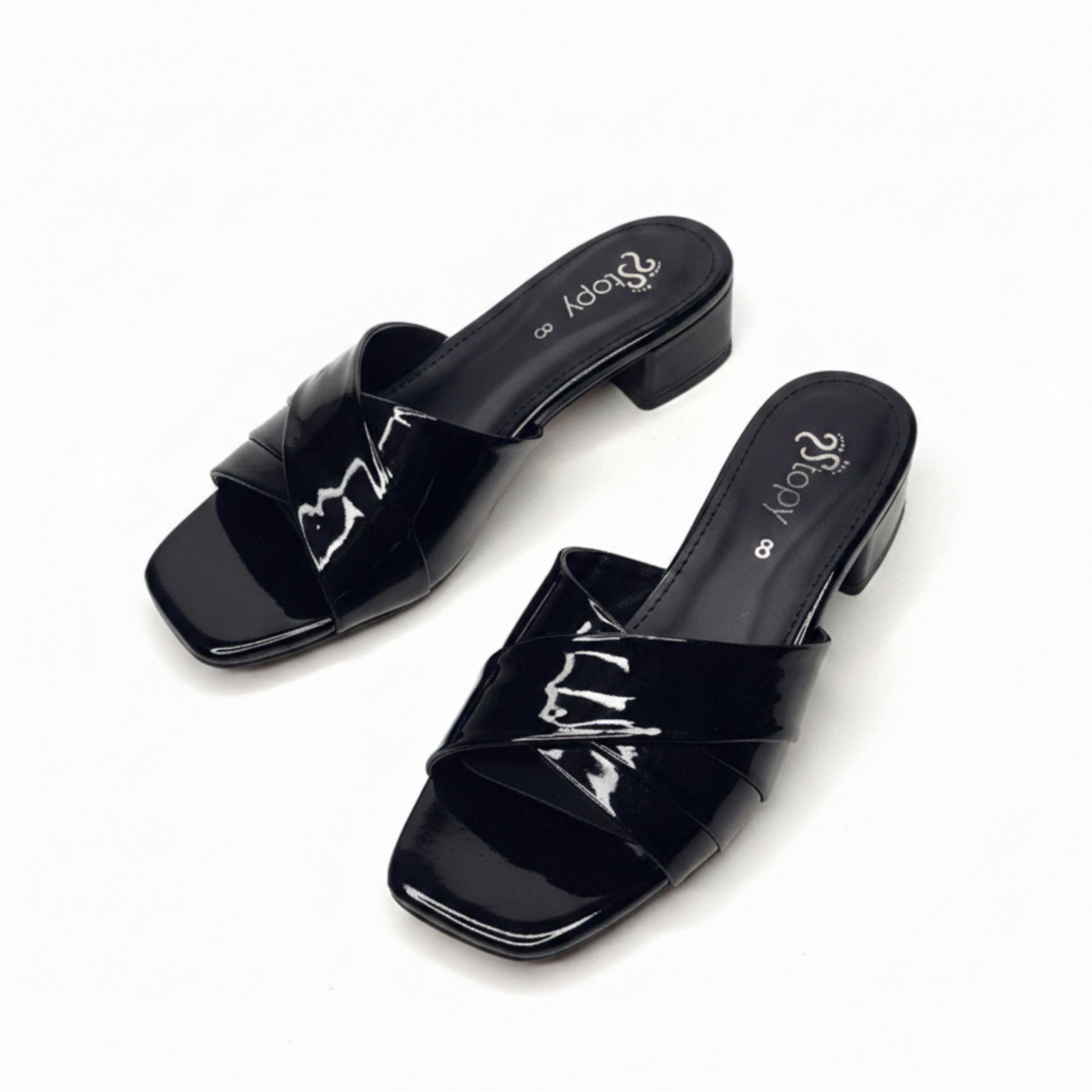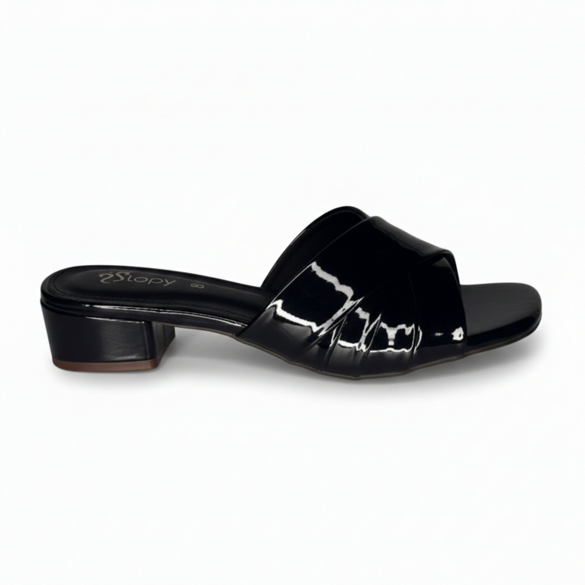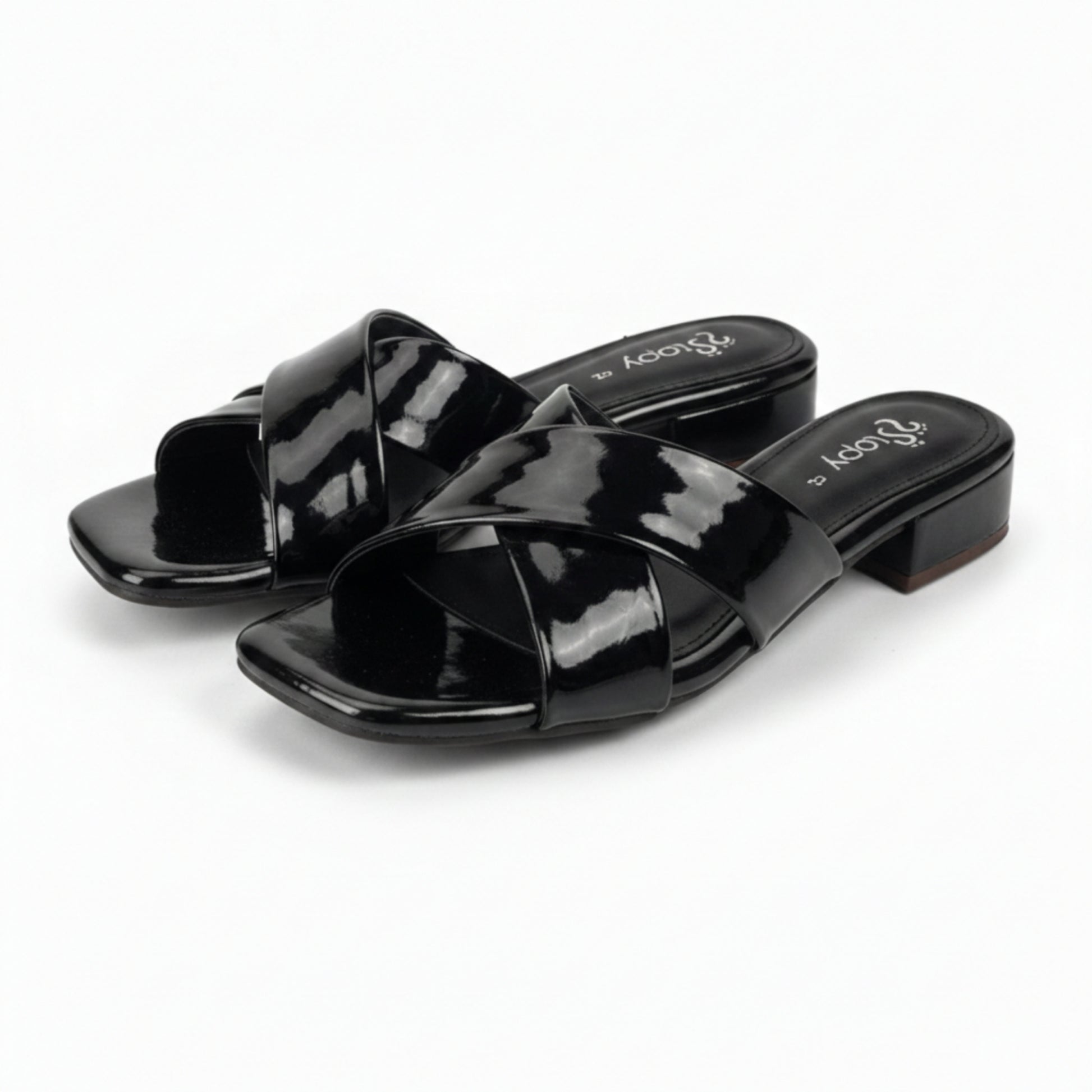 Classic square-toe slide sandals with glossy crossover straps and a sturdy low block heel, offering timeless style and comfortable wear for work, casual, or evening looks.