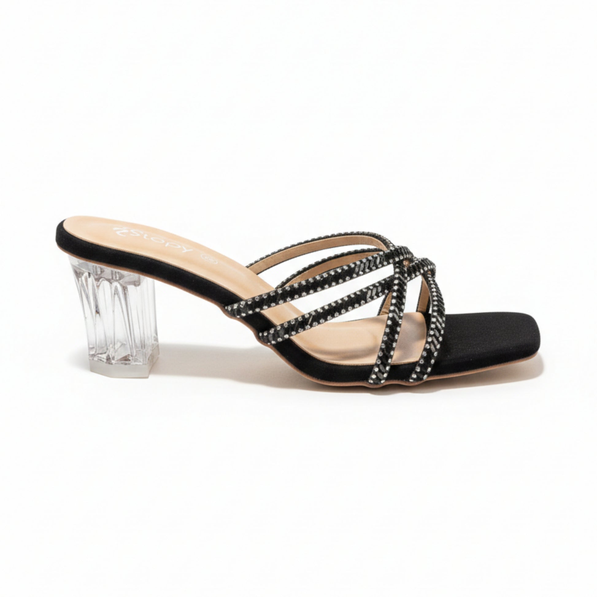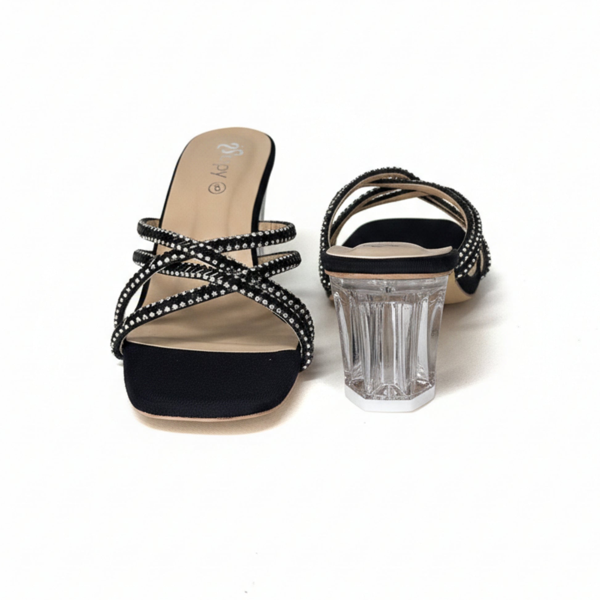 Elegant women’s slide sandals featuring crystal-studded crisscross straps and a comfortable low heel, perfect for evening wear, parties, and polished everyday looks.