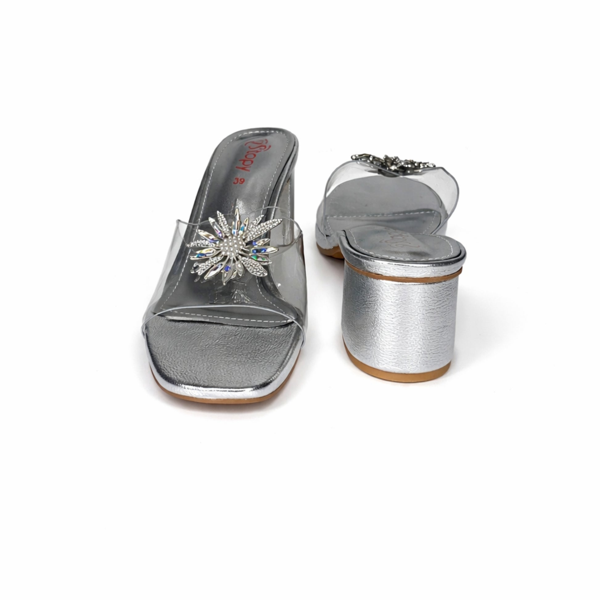 Elegant open-toe slide sandals featuring a transparent strap with floral embellishment and a comfortable low block heel—perfect for weddings, festive wear, and traditional outfits.