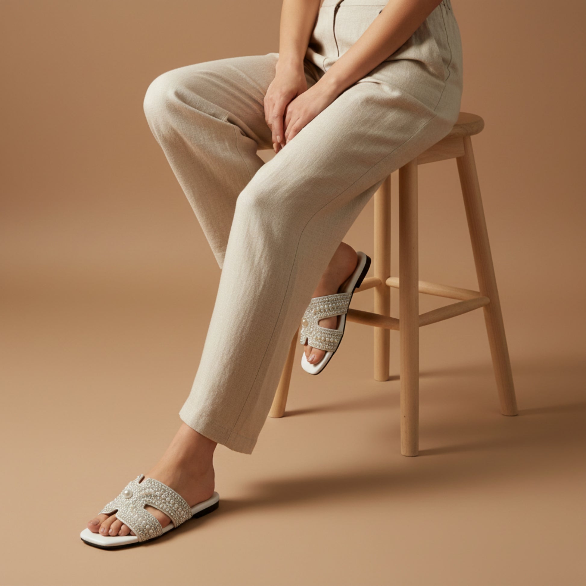 Elegant women’s flat slide sandals featuring pearl and crystal embellishments on a chic cutout strap, designed for comfortable everyday wear and effortless casual styling.